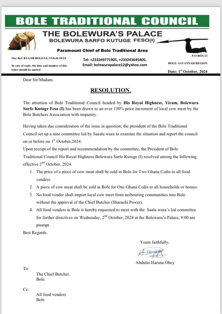 The letter read “The attention of Bole Traditional Council headed by His Royal Highness, Yiram, Bolewura Sarfo Kutuge Feso (1) has been drawn to an over 150% price increment of local cow meat by the Bole Butchers Association with impunity.