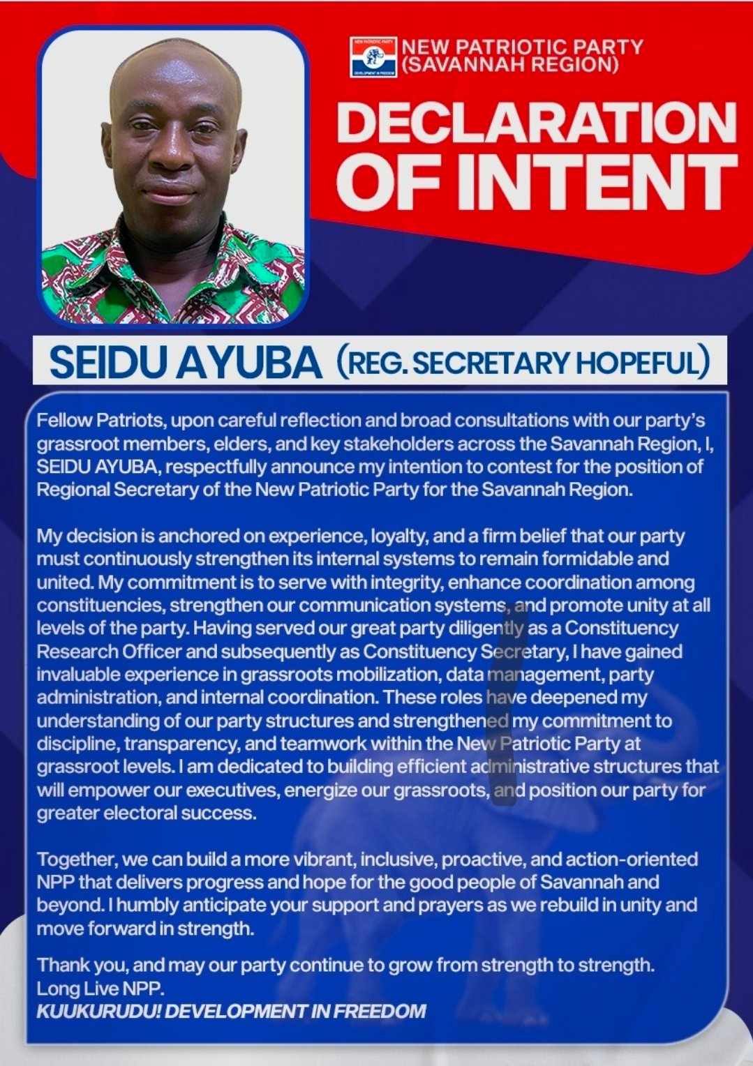 A member of the New Patriotic Party (NPP), Seidu Ayuba, has formally declared his intention to contest for the position of Regional Secretary of the NPP in the Savannah Region.
