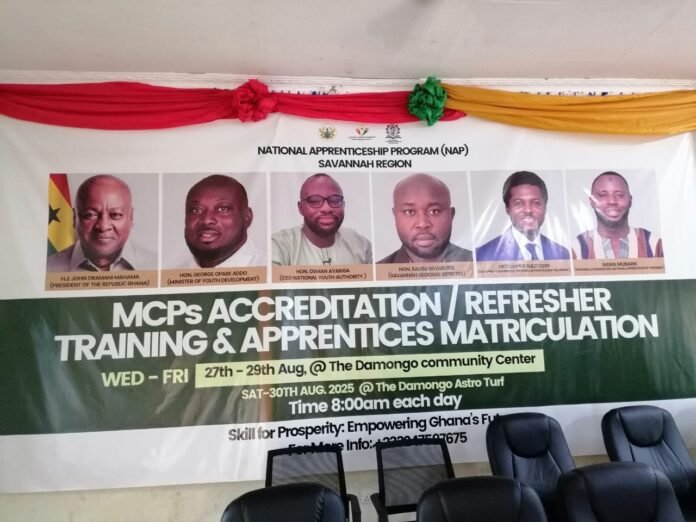 The Savannah region hosted the accreditation/ refresher training for the Master Craft Persons( MCPs) and Matriculation/induction ceremony for the first cohort of the MCPs and apprentices under the National Apprenticeship Program (NAP) of the National Youth Authority (NYA). This event marked the official welcome of selected master craft persons and apprentices into the program. The National Apprenticeship Program is one of many initiatives launched by His Excellency John Dramani Mahama and the National Democratic Congress (NDC). Its aim is to equip young people with employable and entrepreneurial skills while also working to reduce unemployment in the country.