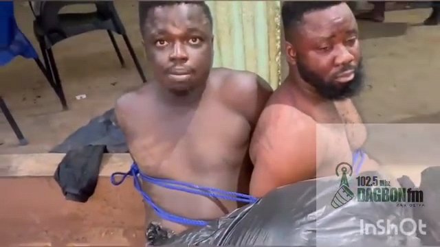 In a viral video circulating on social media platforms on Friday, July 4 shows the two suspects tied together against a pillar, undergoing interrogation.
