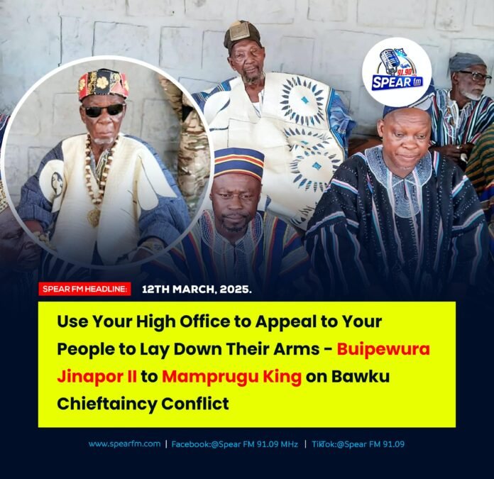 BuipeWura Jinapor II, the Vice President of the National House of Chiefs, paid a visit to Nayiri Mahami Sheriga I, King of Mamprugu, at his palace in Nalerigu on March 12, 2025. The visit was to express his heartfelt gratitude to the King and the people of Mamprugu for their support during his election as the Vice President of the National House of Chiefs.