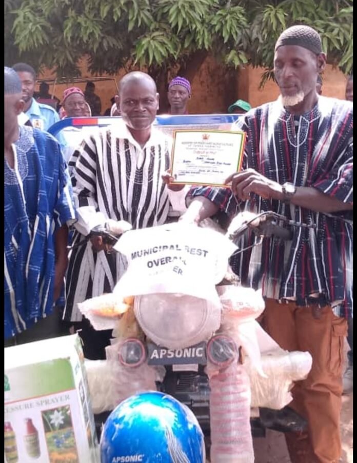 Municipal Best Farmer: Mallam Adam Abutu from Busunu (awarded motorking, knapsack, Wellington boot, cutlasses, and NPK fertilizer), 1st Runner-up: Mr. Gaawe Prosper from Mognori (received motorbike, knapsack, Wellington boot, cutlass, and NPK fertilizer), 2nd Runner-up:** Mr. Mahama Suweidu from Damongo Atributo (awarded chest freezer, knapsack, cutlasses, cloth material, NPK fertilizer, Wellington boot, and sacks)